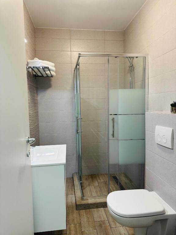 Baie modernă cu cabină de duș, uscător de păr, prosoape și produse de igienă incluse