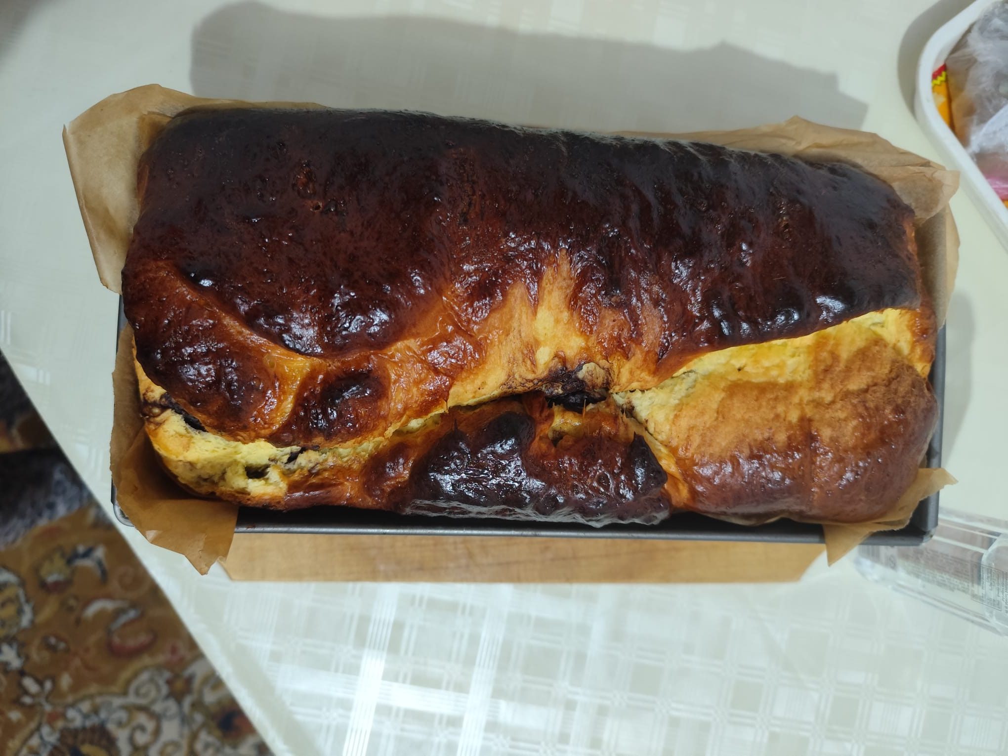 Dupa ce aluatul a crescut, il vom imparti in 2 parti egale, intindem aluatul nu foarte subtire si vom pune jumatate din cantitatea de crema si de rahat(taiat in prealabil in cubulate).
